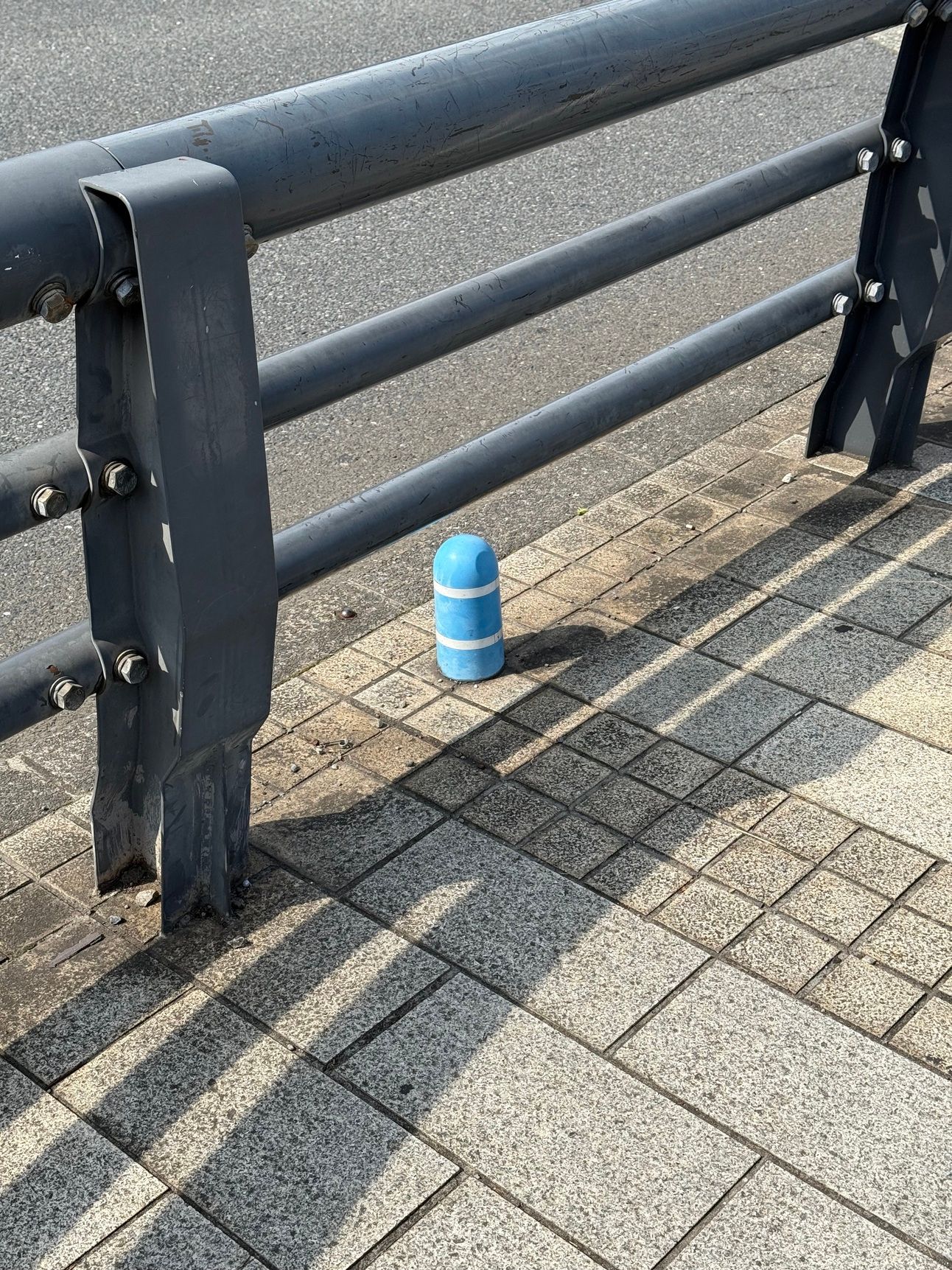 手すりのパイプの質感と曲線。白と青の眩しさを思い返す。