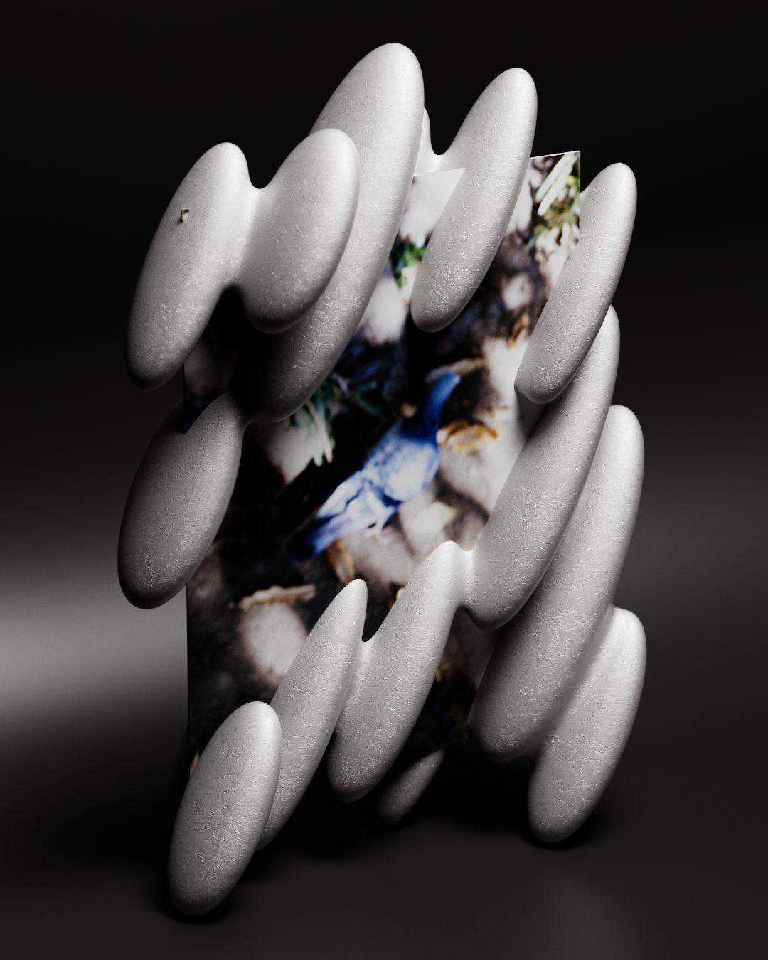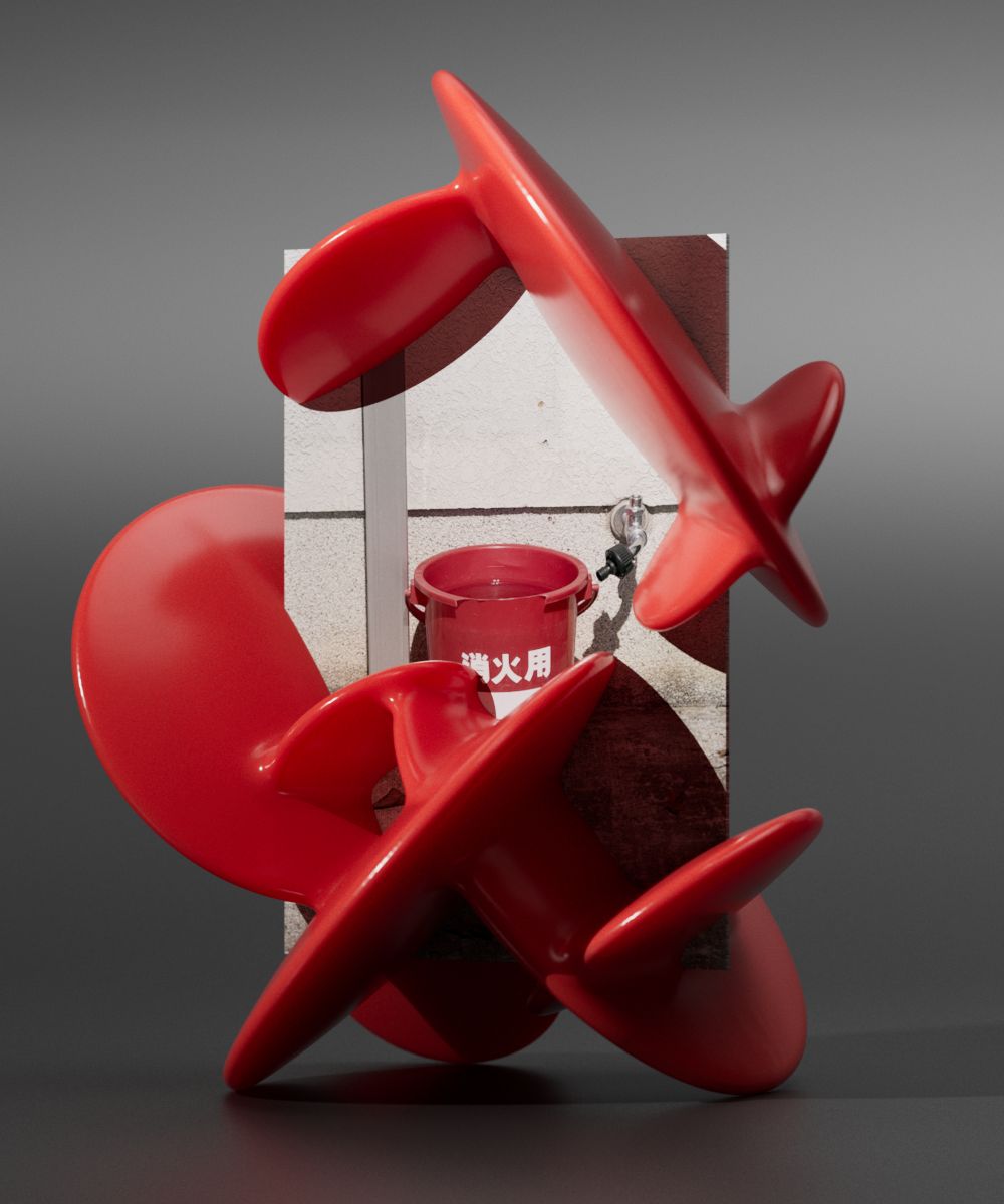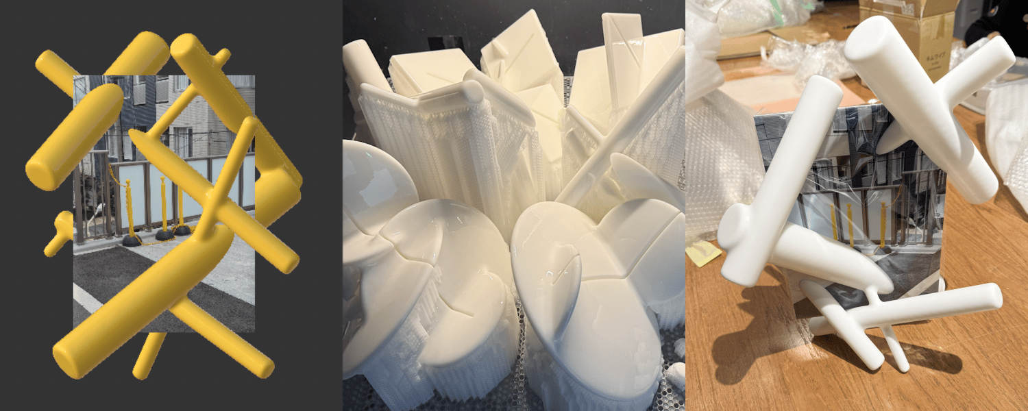 この延長として、写真に対して同様の連想を重ねるコラージュを試してみた。街歩きの中で撮り溜めた何気ない風景写真に対して、思い浮かんだ形を3Dで立ち上げ、板ポリの写真から生やすように配置していく。スケッチの延長のようでもあり、額縁を付け足している感覚にも近く、あるいは風景に絵の具で描き足しているようにも感じられた。