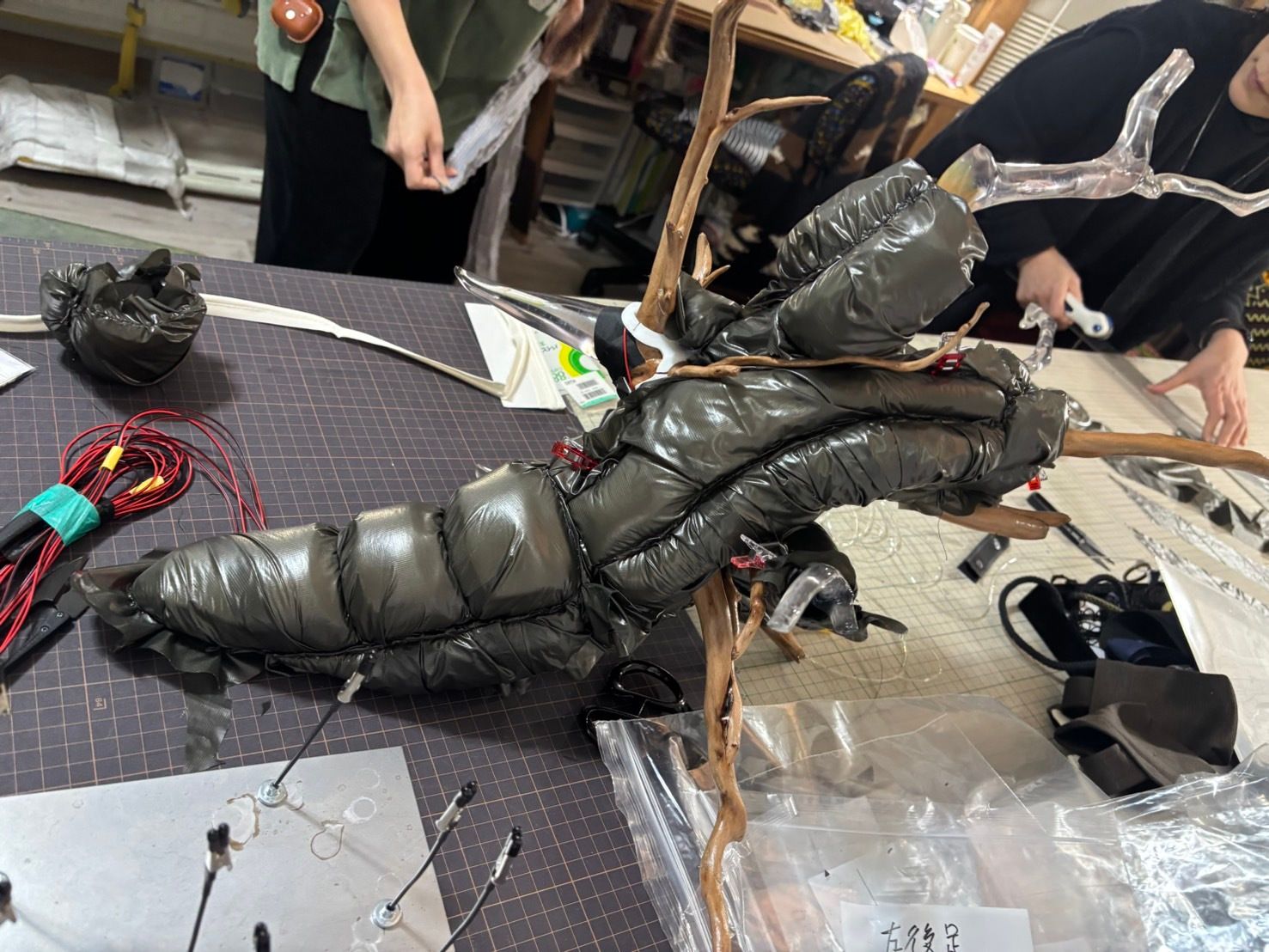 最後に衣装制作に着手した。ダウンジャケットとしての見栄えを重点的に進め、ファスナーやボタンなどの小物を取り入れ木が服を着ているというコンセプトを実現している。