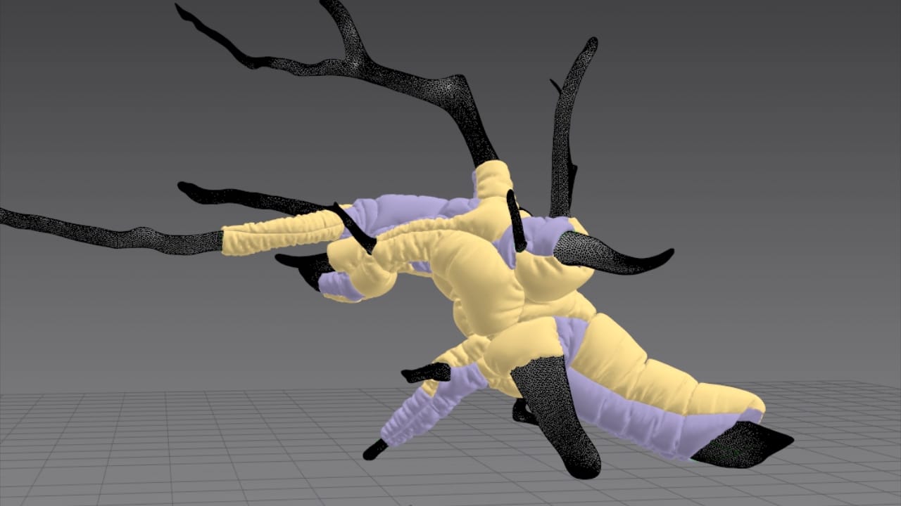 衣装デザインの方向性を探るためのR&D。ダウンジャケットのボリューム感をどうやって表現するのか。